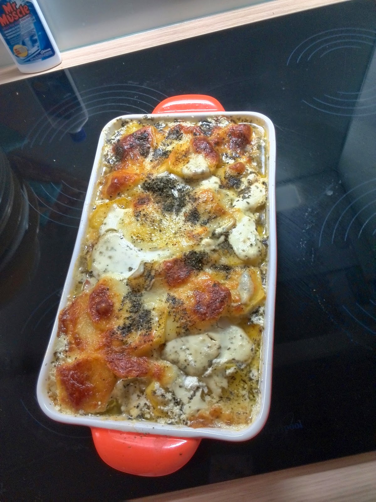 Koori ja viiluta kartulid õhukesteks viiludeks. Võta suurem ahjuvorm ja määri põhi õliga. Kata vormi põhi kartuliviiludega. Maitsesta kartulid soola, basiiliku ja pipraga (mina kasutasin apelsinipipart). Sega kokku hapukoor, veidi soola ja basiilikut. Kata kartulid hapukooreseguga ja lao peale teine kiht kartulitest. Korda eelnevalt tehtut: sool, pipar, basiilik. Lõika mozzarellast kettakujulised viilud ja aseta kartulile. Seejärel hapukoor. Uus kiht kartuleid. Sool, pipar ja basiilik. Tükelda kana ja lisa kartulitele. Hapukoor. Uus kiht kartuleid. Sool, pipar ja basiilik. Mozzarella viilud ja hapukoor. Pane ahju 200 kraadi juurde küpsema umbes 45 minutiks.