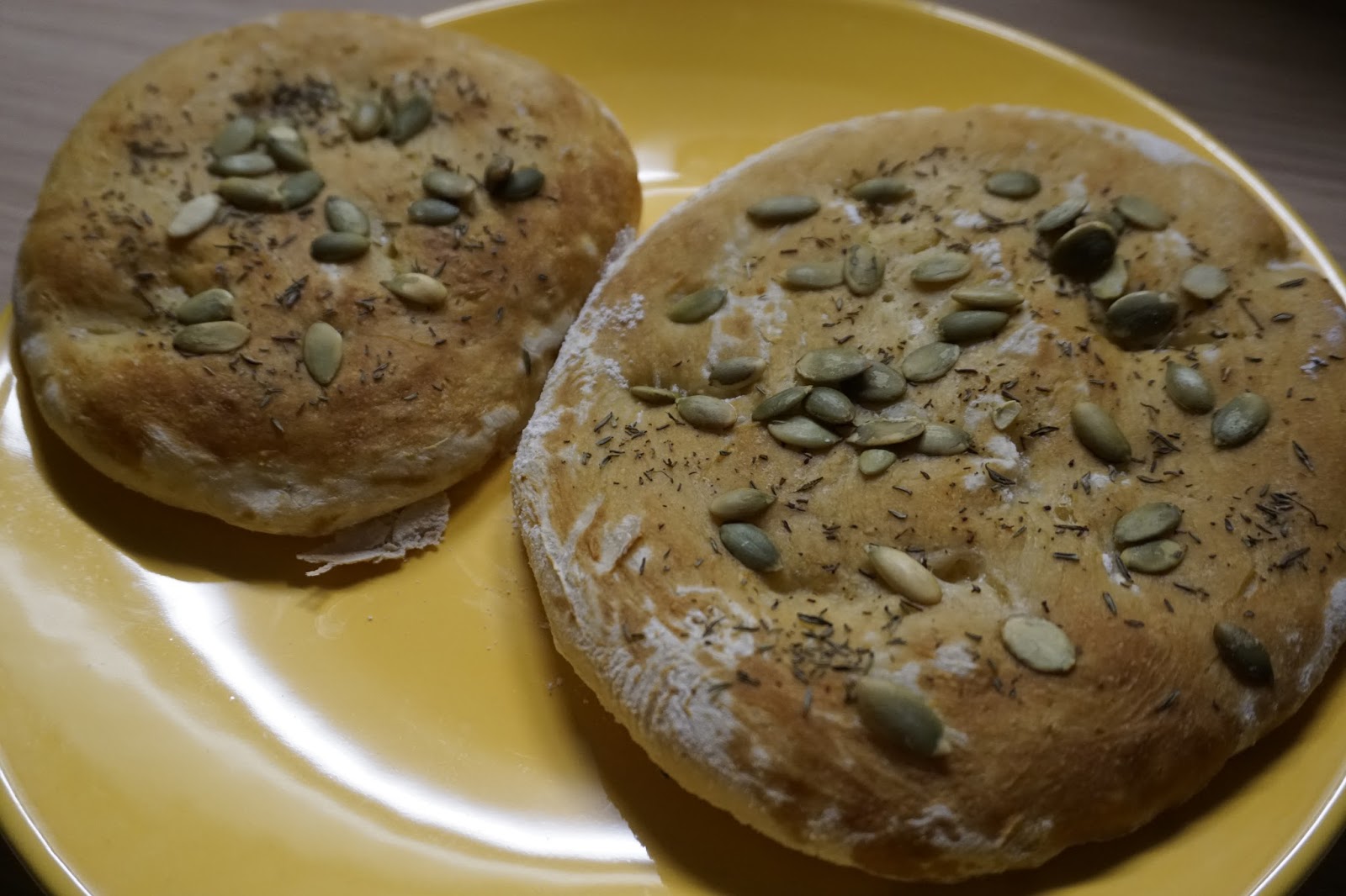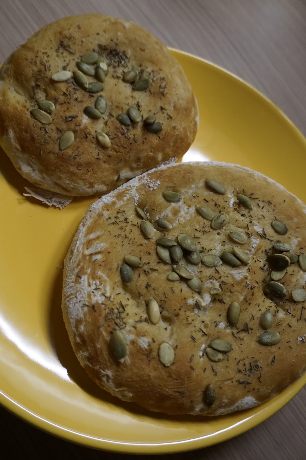 Tee plaadil olevatele ristkülikutele noaga 3-4 sisselõiget, määri kokku soodaveega (annab hiljem ilusa kuldpruuni värvi) ja maitsesta meelepäraste maitsetaimede või seemnetega. Traditsiooniliselt kasutatakse vist köömneid, aga kuna mulle nad väga meelepärased ei ole, siis kasutasin tüümiani ja kõrvitsaseemneid.