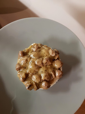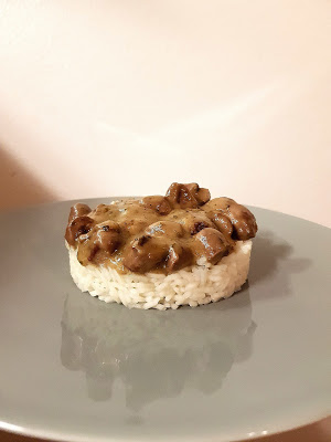 Kuumuta pannil õli. Prae mõned minutid hakitud sibul ja tükeldatud seened. Lõika broilerisüdamed pooleks ning lisa pannile. Maitsesta soola ja küüslaugupulbriga. Kuumuta kuni süda tundub enamvähem valmis. Lisa kuivatatud pune, puljong ja must pipar. Sega läbi ja lase keema tõusta. Lisa eelnevalt valmistatud õli-jahu segu. Sega. Alanda kuumust ja lase veel kümmekond minutit kaane all podiseda. Vajadusel lisa soola.