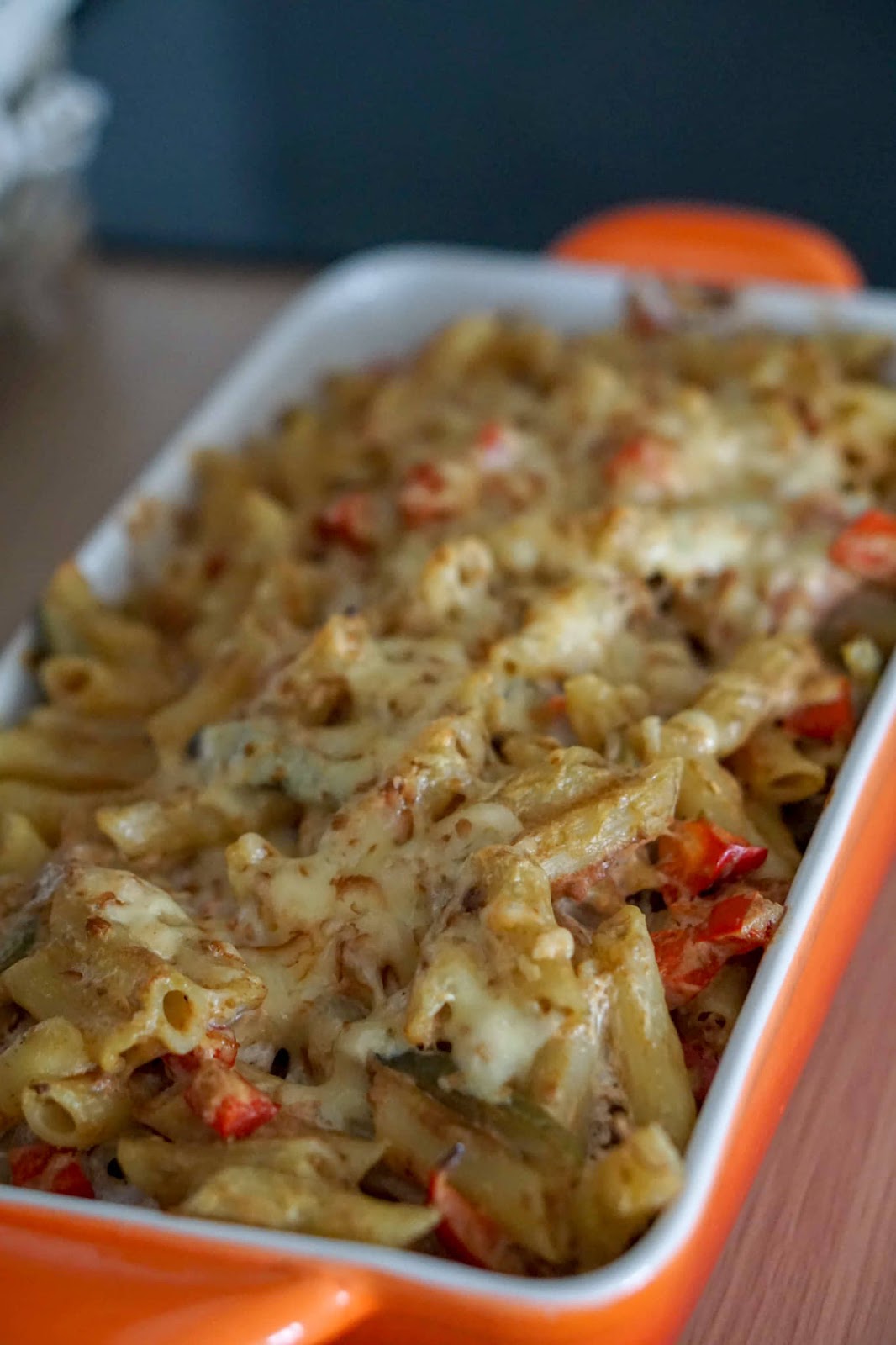 Keeda makaronid. Kurna. Sega hulka pasteet, hapukoor, tükeldatud peekon, kurk ja paprika, maitsesta soola ja maitseürtidega (mina kasutasin Piramide makaroni-spageti maitseainet). Vala segu ahjuvormi ja puista üle riivjuustuga. Lase ahjus olla 200 kraadi juures umbes 20 minutit. Serveeri.