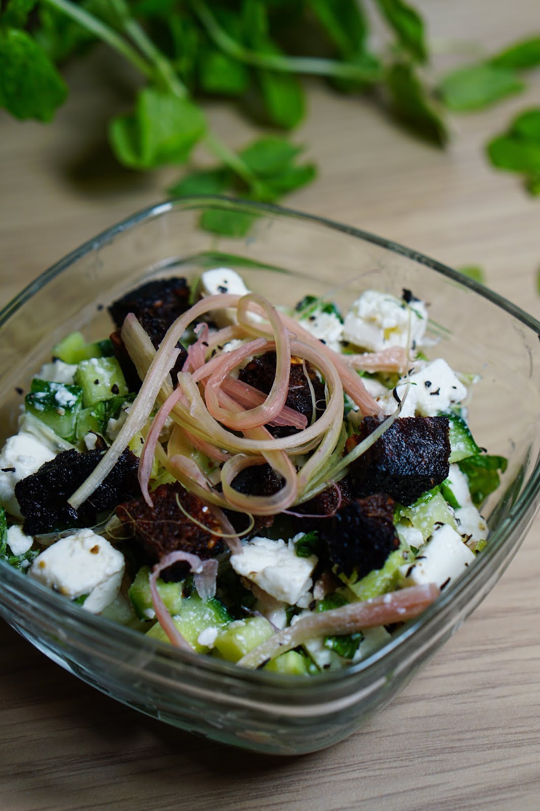 Tükelda leib ja prae pannil krõbedaks. Tükelda juust ja kurk. Haki piparmünt. Rebi rabarberist peened ribad. Sega komponendid kausis kokku ja naudi kohe!