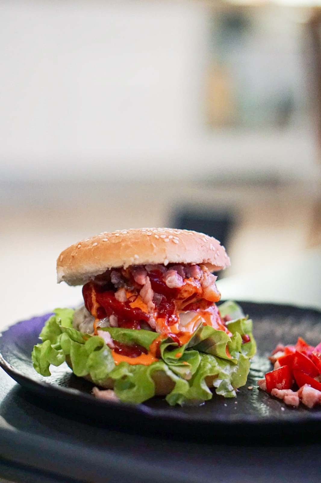 Lisa eelnevalt praetud peekon + salatilehed, viilutatud tomatit, ketšupit ja sinepit. Kui soovid krõbedamat burgerit, võid saiu enne pannil röstida.