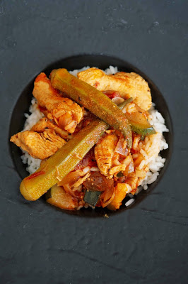 Lisa pannile õli, aja kuumaks ja prae kana igast küljest kuldpruuniks. Lisa veel küüslauku, tšilli ja paprikapulber. Sega läbi. Lisa tükeldatud sibul ja tomatid ja hauta 2-3 minutit, kuni sibulad muutuvad klaasjaks. Lisa kanapuljong ja suvikõrvits. Lase keema tõusta. Ja keeda kuni kaste hakkab paksenema (umbes 20 min). Lisa okra ja keeda veel umbes 5 minutit. Vajadusel lisa soola. Serveeri riisiga.