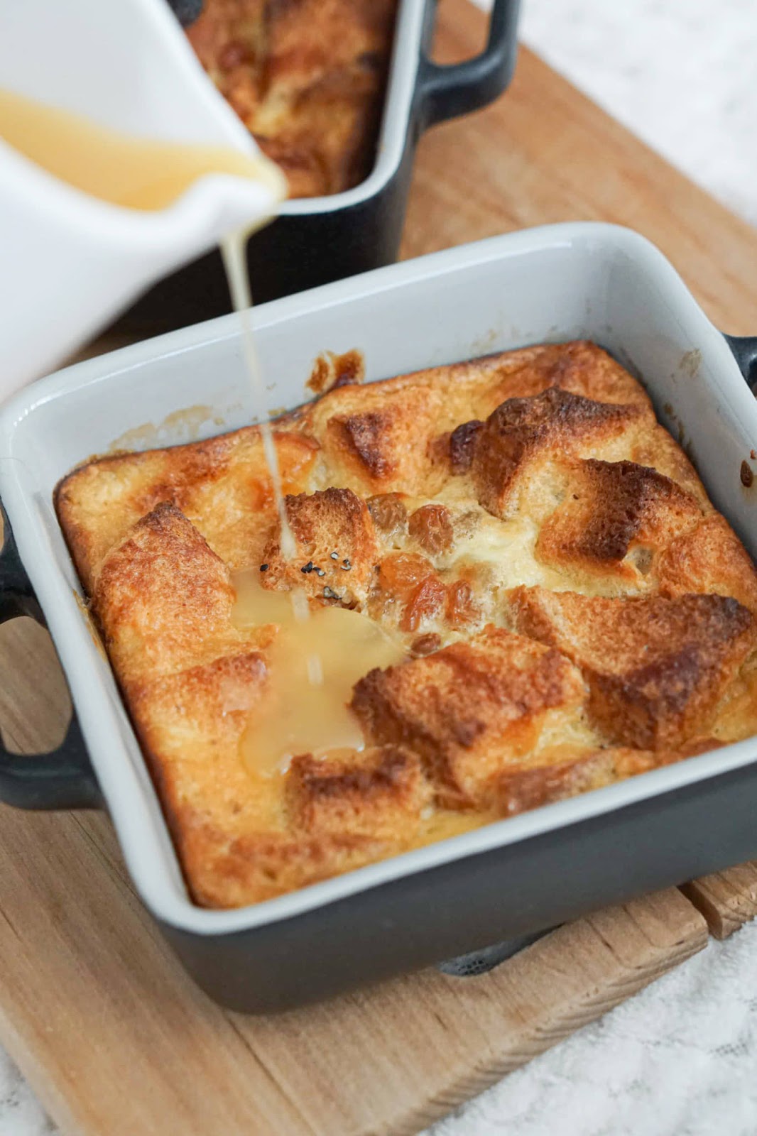 Võta keskmise suurusega pott/ kastrul ja sega keskmisel kuumusel kokku piim, suhkur ja või. Kuumuta 4 minutit. Võta väike kauss ja pane rosinad umbes 5 minutiks likku. Võta uus kauss ja sega omavahel kokku munad, vahukoor ja maitseained. Lisa juurde eelnevalt valmistatud piimasegu ja leotatud rosinad. Vala segu saiakuubikutele. Sega korralikult läbi ja küpseta 190 kraadises ahjus umbes 30 minutit.