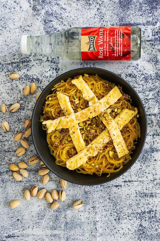 Võta pann. Sulata 1 tl võid. Lisa maitseained (kurkum, kaneel, kardemon ja pipar). Sega ja lase maitsetel võiga seguneda. Lisa nuudlid ja sega korralikult läbi. Lisa suhkur, roosivesi ning pool eelnevalt seisma pandud safraniveest. Sega läbi ja prae mõni minut. Tõsta tulelt serveerimistaldrikule.