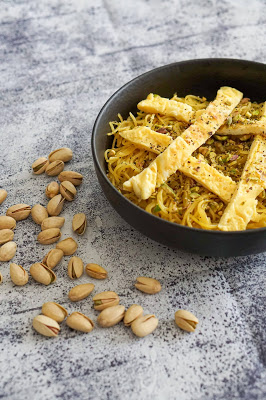 Puista taldrikul olevad nuudlid üle pistaatsiapähklitega, lisa munaribad ja soovi korral veel musta pipart. Head isu!