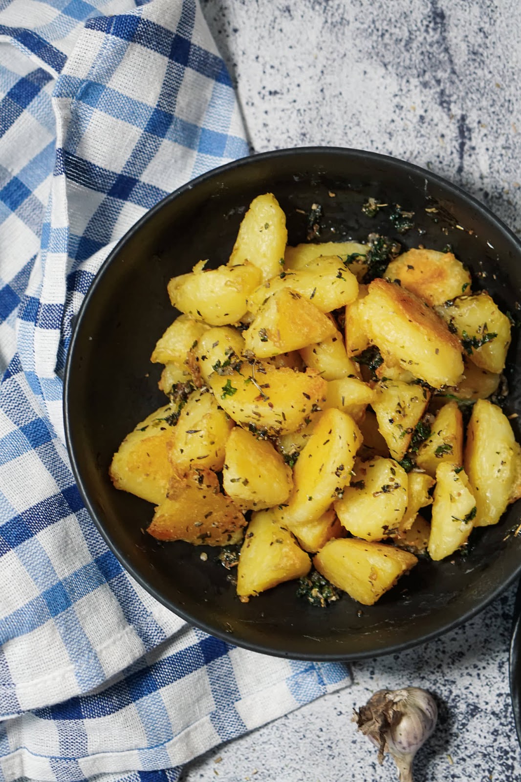 Tõsta kartulid ahjust ja siinkohal saad uuesti kasutada eelnevalt valminud küüslaugusegu. Puista kartulid selle seguga üle ja sega läbi.