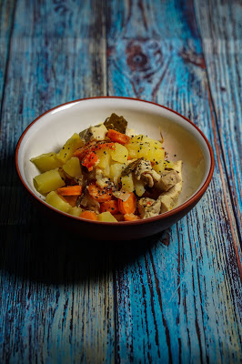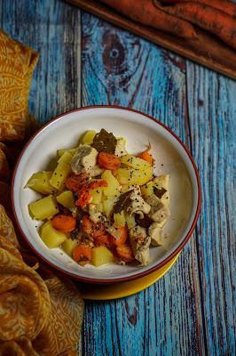 Kuumuta potis õli. Lisa hakitud sibul ja tükeldatud tšilli ning prae läbi, et maitsed saaksid eralduda. Prae kuni sibul hakkab pruunistuma. Tükelda kartulid ja porgandid ning lisa potti. Lisa tšillihelbed, loorberilehed, maitseaine (kasuta ükskõik millist endale meelepärast maitseainesegu), kana, 1/3 tassi laimi mahla ja vesi. Lase keema tõusta ja alanda kuumust. Kui segu on liialt paks, võid vett juurde lisada. Minul jäigi vett väheks ja valminud toit oli küllalt paks, ent see-eest mitte vähem maitsev.