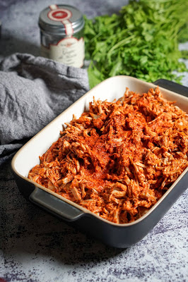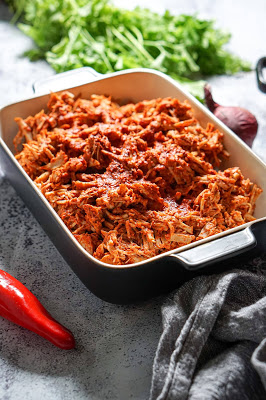 Kui liha on valmis, võta ta ahjust, rebi katki. Vala üle vormi põhja jäänud kastmega (et ei jääks kuiv) ja serveeri nt tacodega. Kaunista juustu, koriandri ja laimilõikudega.