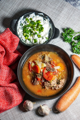 Lõika liha kuubikuteks ning lõika kõik ülejäänud komponendid väiksemateks tükkideks. Maitsesta liha soola ja pipraga. Aseta ahjupotti köögiviljad – liha – köögiviljad (just sellises järjekorras). Lisa tomatipüree, paprikapulber ja maitsesta veel soola ja pipraga. Vala peale vesi nii, et kõik oleks kaetud. Küpseta kõrgel kuumusel ahjus 2 tundi.