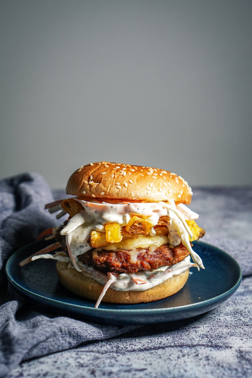 Pane kokku burger: sai – kapsasalat – pihv – kodused kartulid – kaste – salat – sai.