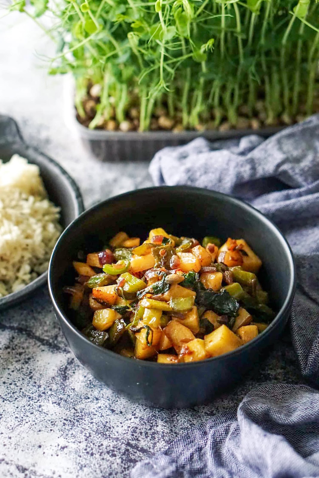 Haki sibul ja tükelda paprika. Kuumuta pannil õli ning prae sibul ja paprika pannil koos karri ja peri peri maitseainega (kuni sibul on pehme). Lisa tükeldatud kartulid ja (terved) spinatilehed. Lisa veidi vett ja kuumuta 10 minutit aeg-ajalt segades. Vajadusel lisa juurde vett ja maitseaineid. Serveeri!