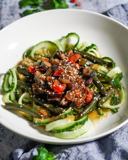 Spiraalita/viiluta kurk. Lisa hulka oad ja seened ning maitsesta eelnevalt valmistatud kastmega. Kaunistuseks puista üle seesamiseemnetega.