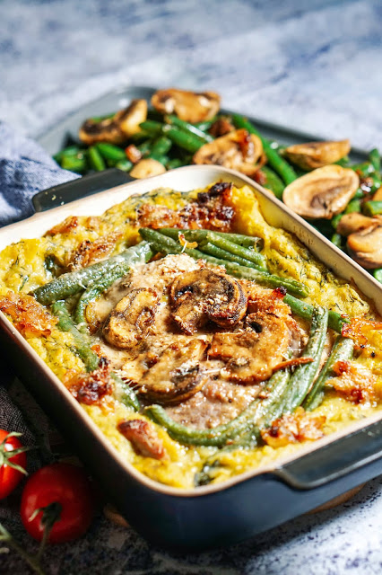Võta paraja suurusega ahjuvorm ning kata selle põhi ja ääred kartuli-kõrvitsa pudruga. Aseta keskele sealiha, kata seente ja ubadega ning kõige peale lisa parmesani juustu. Küpseta 200 kraadises ahjus kuni vorm muutub kuldpruuniks.