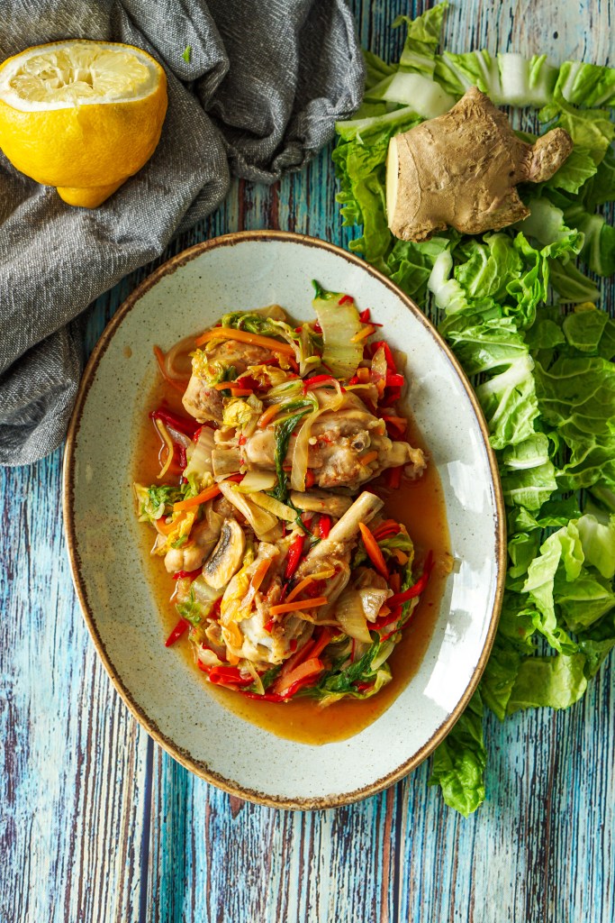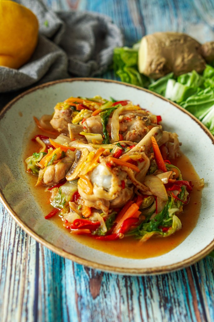 Kuumuta pannil õli ja prae seal küüslauk, ingver ja tšilli. Ole ettevaatlik, et küüslauku ära ei kõrveta! Lisa kana ja prae kuni kanast tulnud vedelik on pannilt läinud. Maitsesta soolaga. Lisa hulka porgand, paprika, sibul ja seened. Prae mõned minutid. Lisa tükeldatud kapsas ja austrikaste. Sega korralikult läbi. Kui kõik on korralikult kaetud ja kaste hakkab paksenema, tõsta toit tulelt. Vajadusel lisa maitseks soola. Serveeri koheselt nt riisiga. Piserda üle sidruni- või laimimahlaga.