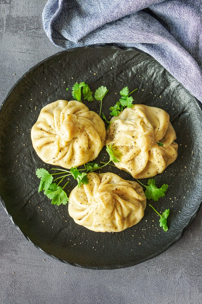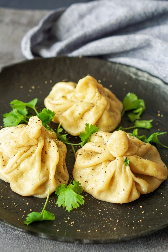 Vaja läheb: Tainas: 2 tassi jahu 1 muna (lahti klopitud) 0,5 tassi vett 0,5 tl soola õli (määrimiseks) Täidis: 300 g hakkliha 3/4 tassi vett 1 väiksem sibul (hakitud) 1-2 küüslauguküünt (hakitud) 2 tl värsket koriandrit (hakitud) 0,5 tl kuivatatud koriandrit 0,5 tl paprikapulbrit 0,5 tl musta pipart soola Lisaks: loorberilehti