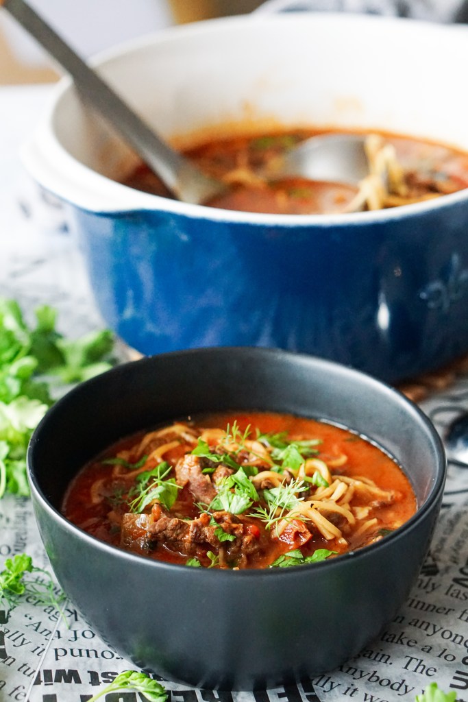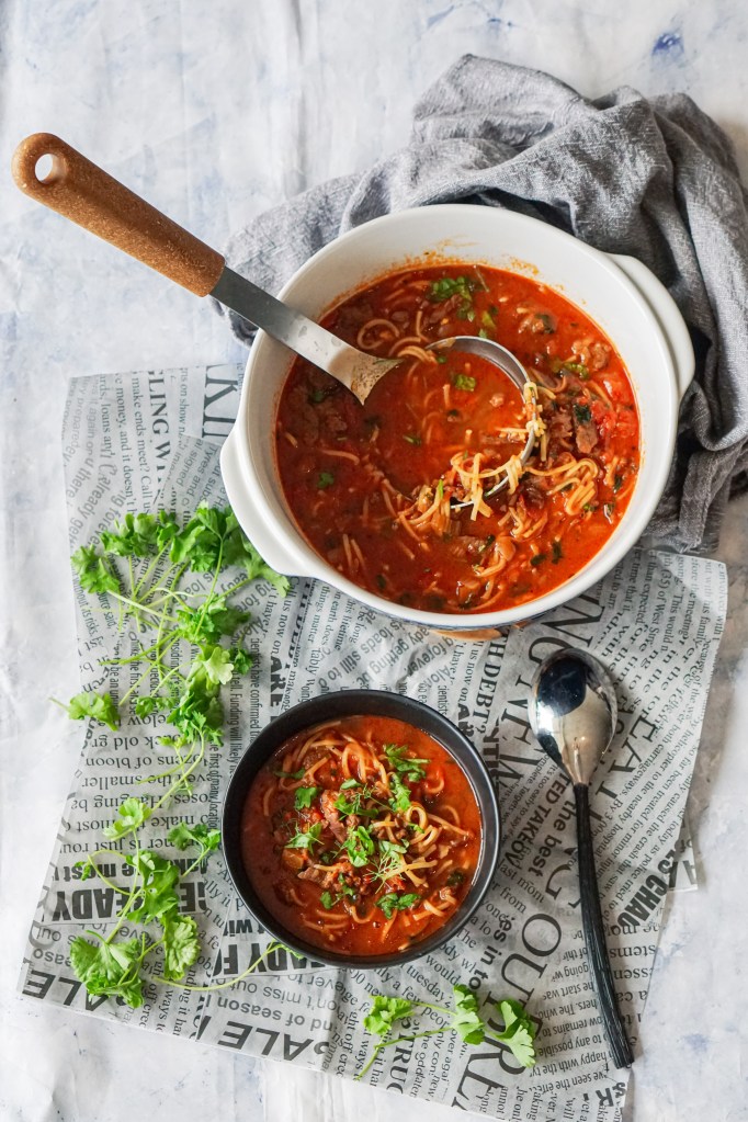 Vaja läheb: 400 g veiseliha 1 purk tükeldatud tomateid 0,5 tassi nuudleid 0,5 sibulat 1 sellerivars 2 küüslauguküünt 4 tassi puljongit 0,5 tl paprikapulbrit 0,5 tl koriandrit 1-2 loorberilehte 1 tl sidrunimahla 2-3 spl värsket peterselli 2-3 spl värsket tilli õli soola ja pipart