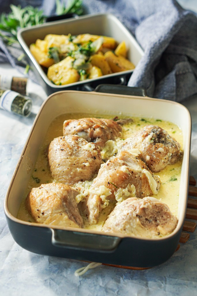 Vaja läheb: 500 g kondiga kana 1 tl võid 1 klaas piima 4-5 küüslauguküünt soola ja pipart õli