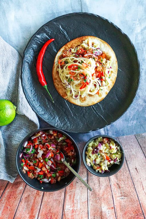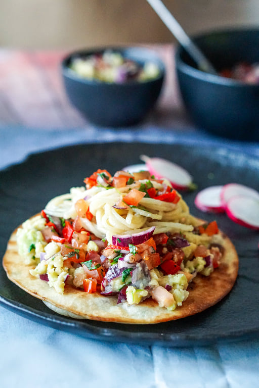 Prae pannil tortillad. Mina kasutasin poest ostetud tortillasid, aga saab ka ise teha. Kata praetud tortilla guacamole, salsa, viilutatud rediste ja keedetud spagettidega. Naudi!