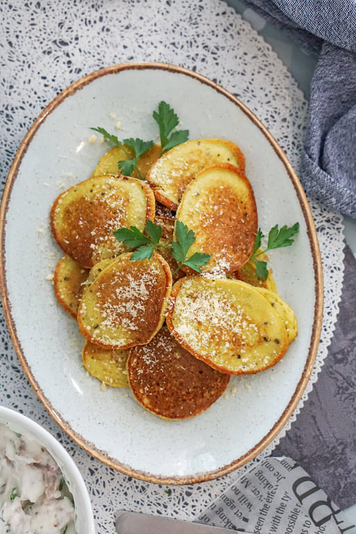 Blenderdades jääb tainas mõnus kreemjas. Petersell annab kookidele kergelt roheka tooni (piltidelt küll väga välja ei paista). Ja koogid ei lagune pannil ringikeerates laiali. Soodne ja maitsev retsept. Mina serveerisin suitsukana ja kreeka jogurti kastmega.
