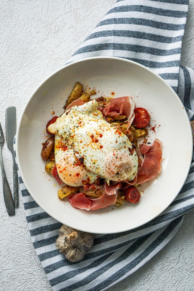 Kuumuta pannil õli ja lisa sinna hakitud sibul. Lõika kartulist õhukesed ribad (tee nö ise friikartulid) ja lisa samuti pannile. Lisa küüslauk, petersell ja pipar. Õli võiks olla nii palju, et kartulid oleksid korralikult kaetud. Alanda kuumus madalale. Prae (aeg-ajalt sega) kuni kartulid hakkavad pruunistuma. Tõsta kartulid pannilt paberile, et lahti saada liigsest rasvast ja seejärel serveerimistaldrikule. Lisa serrano sink ja chorizo viilud.
