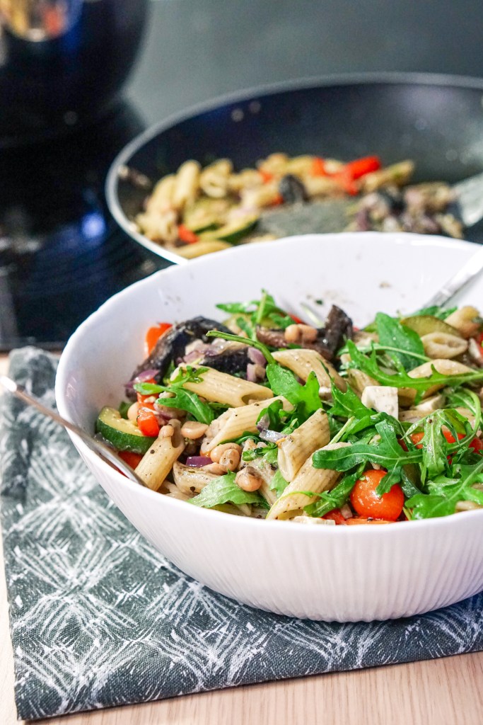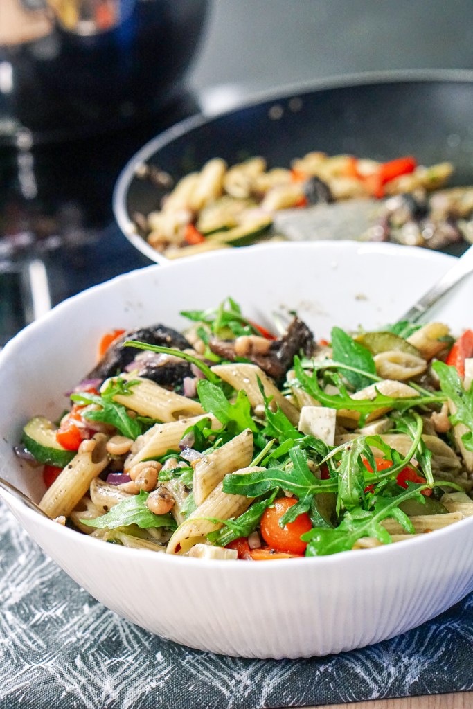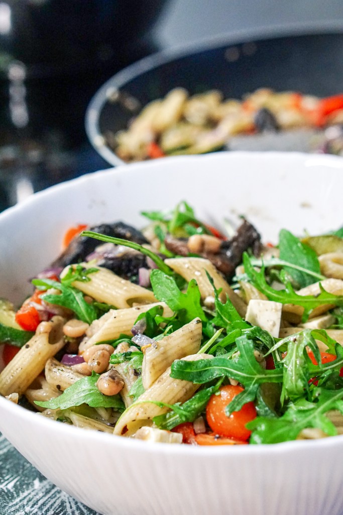 Vaja läheb: 100 g keedetud penne pastat 2 küüslauguküünt 0,5 suvikõrvitsat 4-5 šampinjoni 0,5 paprikat 0,5 purki konservube 1 spl võid 1 spl värsket koriandrit 1 spl sidrunimahla 0,5 punast sibulat ürdisoola musta pipart tšillihelbeid rukolat kirsstomateid feta juustu