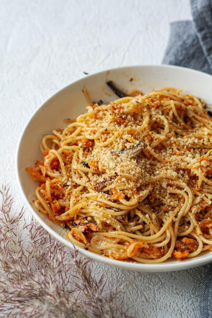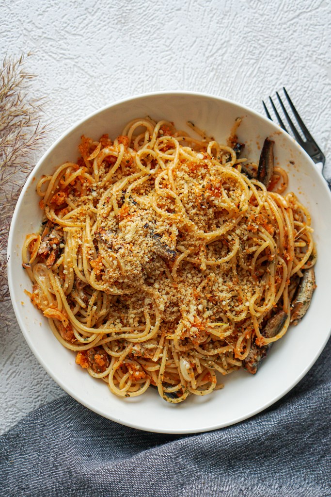 Vaja läheb: 100 g spagette 100 g sprotte (nt tomatikastmes) 3 spl õli 1 spl võid 6 küüslauguküünt 0,5 tl tšillihelbeid 0,5 tassi panko riivsaia 0,5 tl sidrunimahla ja sidrunikoort soola veidi riivjuustu peterselli