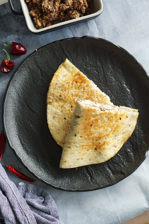 Määri tortilla oamäärdega. Sellele omakorda tõsta hapukoort ja riivitud juust. Voldi tortilla keskelt kokku. Prae pannil mõlemalt poolt kuldseks (umbes minut).