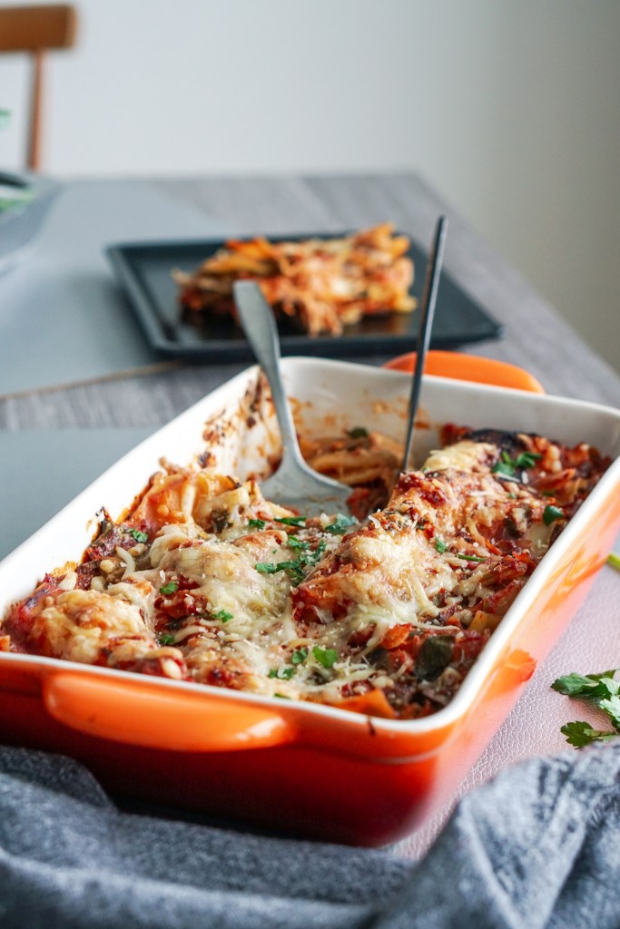 Vaja läheb: ~9 lasanjeplaati (olenevalt vormi suurusest) 500 g pardikoiva confit (Linnamäe Lihatööstus) 400 g tükeldatud tomateid (konserv) 100 g rabarberiketšupit (valikuline) veidi srirachat 2 peotäis värsket peterselli 0,5 sibulat 3 küüslauguküünt 100 g mozzarella kirsse 100 g riivjuustu veidi riivitud parmesani õli soola ja pipart