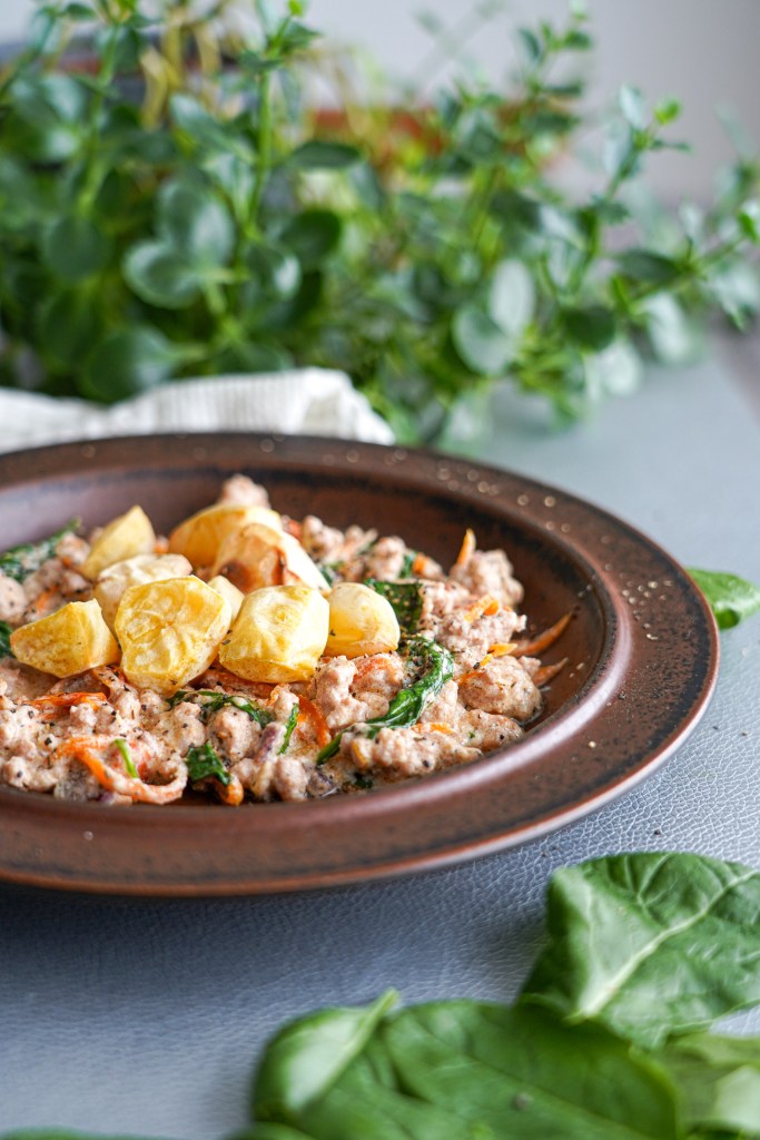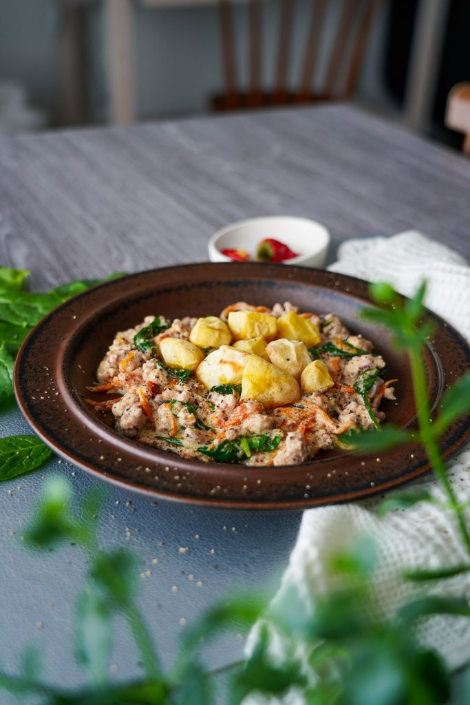 Vaja läheb: 300 g küüliku jahvatatud lihamassi 200 g hapukoortveidi vett 2 spl kanarasva 0,5 punast sibulat (hakitud) 1 porgand (riivitud) 4-5 kirsstomatit (poolitatud) kuivatatud ürdisegu 0,5 tl küüslaugusoola soola pipart peotäis spinatit Kartuleid (praetud või keedetud)