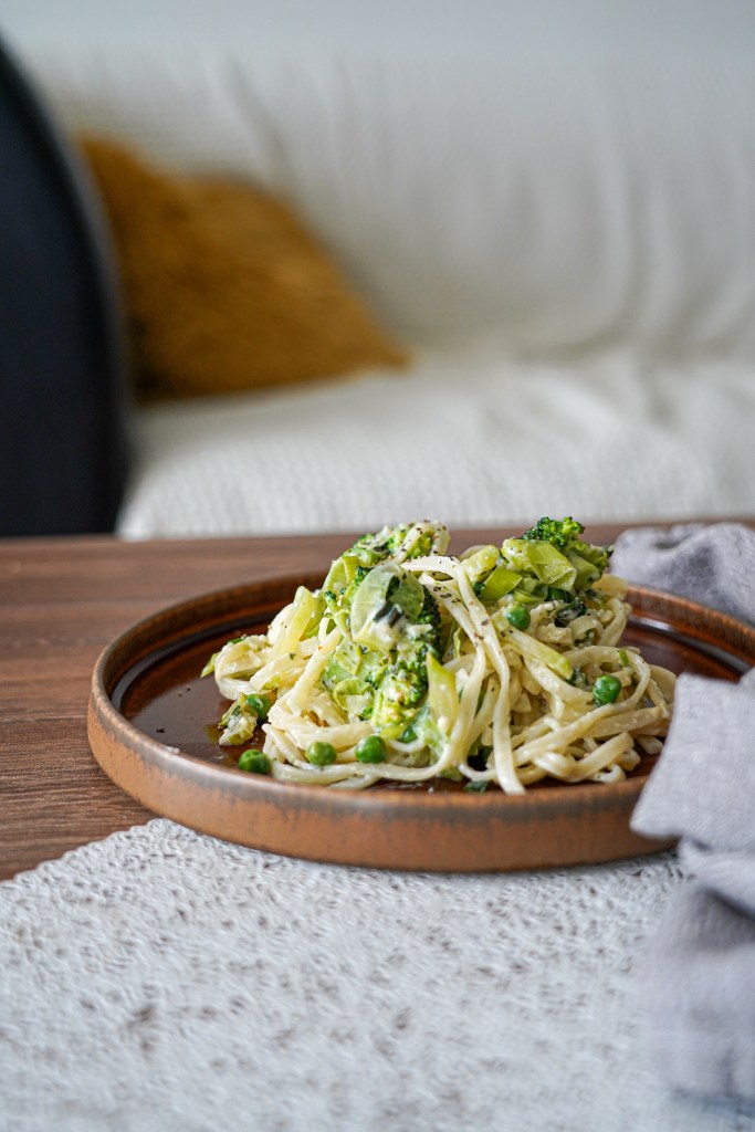 Vaja läheb: 100 g porrut 200 g brokoliõisikuid 1 tl oliiviõli 5 g kuivatatud küüslauku 10 g rohelist sibulat 0,25 tl tšillihelbeid veidi soola musta pipart 100 g värskeid või sügavkülmutatud herneid 10 g värsket basiilikut 0,25 tl kuivatatud oreganot 0,25 tl kuivatatud piparmünti 200 g pastat (nt spagette) 100 g kreem- või toorjuustu