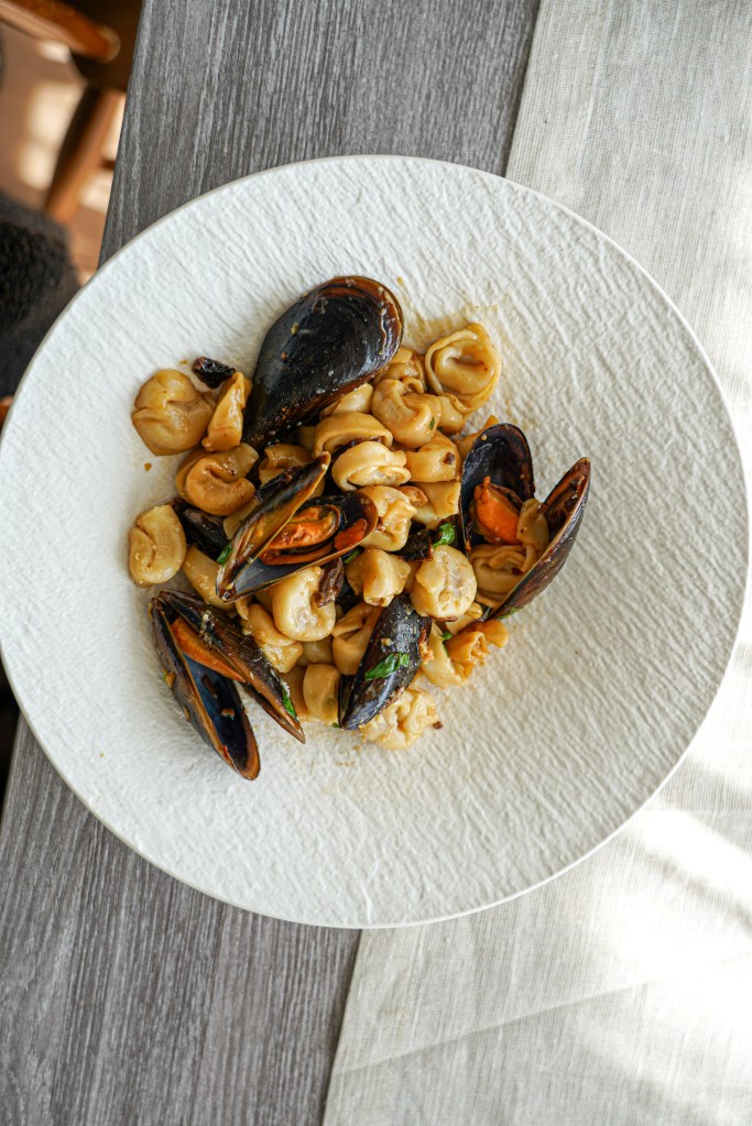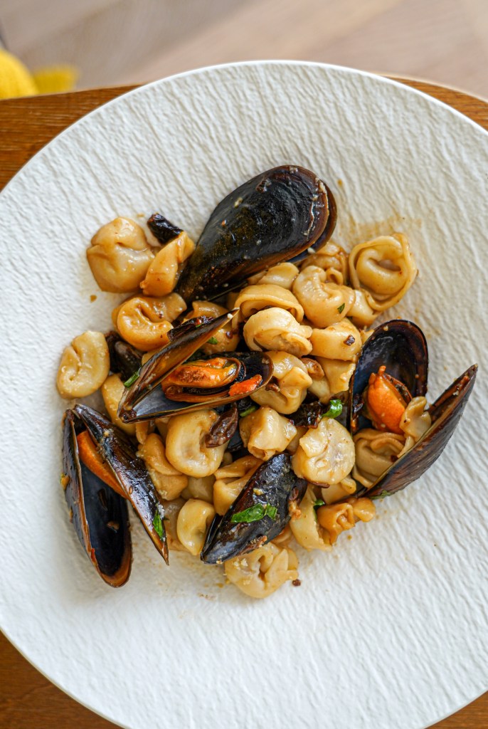 Vaja läheb: 200 g tortellinisid 500 g rannakarpe (terved karbid) 20 g päikesekuivatatud tomateid peotäis värsket basiilikut 20 g parmesani sool ja pipar Küüslauguõli: 1/3 tassi oliiviõli 1 tl kuivatatud küüslauku veidi tšillihelbeid