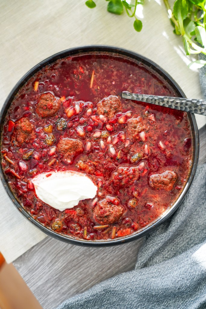 Prae rosinad kergelt võis koos 1 tl kuivatatud piparmündiga läbi. Lisa serveerimisel supile. Lisa serveerimisel lusikatäis maitsestamata jogurtit ja granaatõuna seemneid.